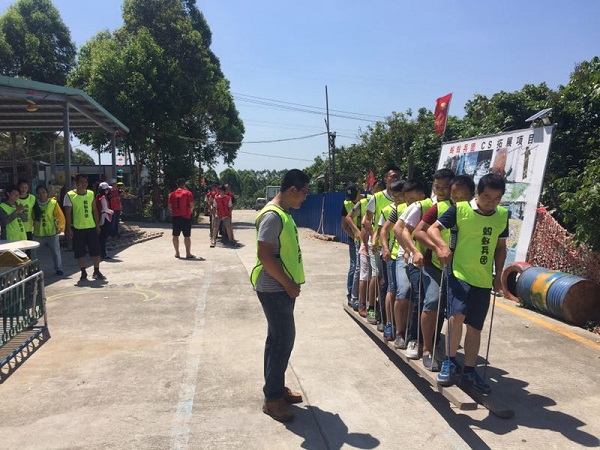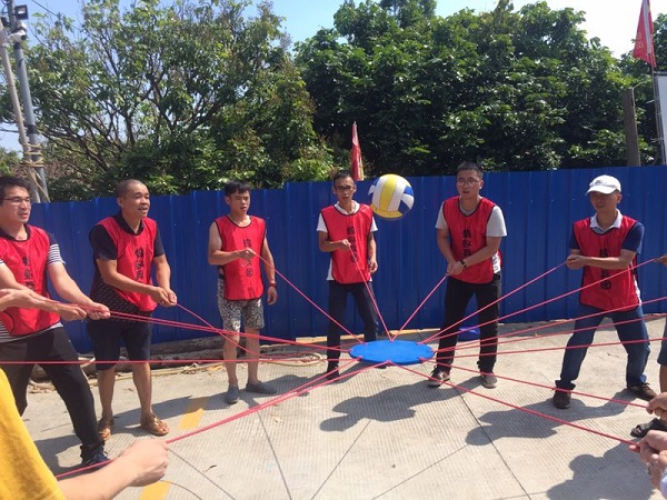 團隊在當天上午9點半左右到達目的地,經過短暫的休息后,進行了分組團隊建設及熱身小活動。緊接著,作為活動的第一個項目“無軌列車”隆重登場了,本項目要求團隊成員雙腳分別站在兩塊長約5~8米,安裝有10個提繩的長條木板上并手握提繩,行走一定的距離。由于剛開始大家沒有找到項目的技巧,舉步難行,兩隊都是東倒西歪,經過磨合溝通后,最終順利地完成了比賽。該項目提升了團隊激情及凝聚力。
